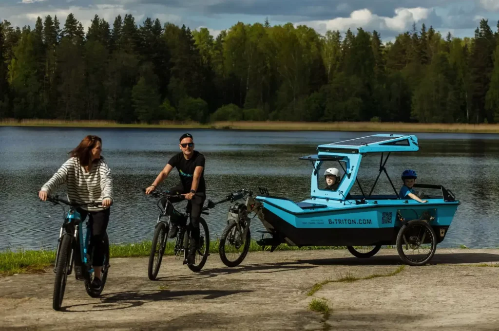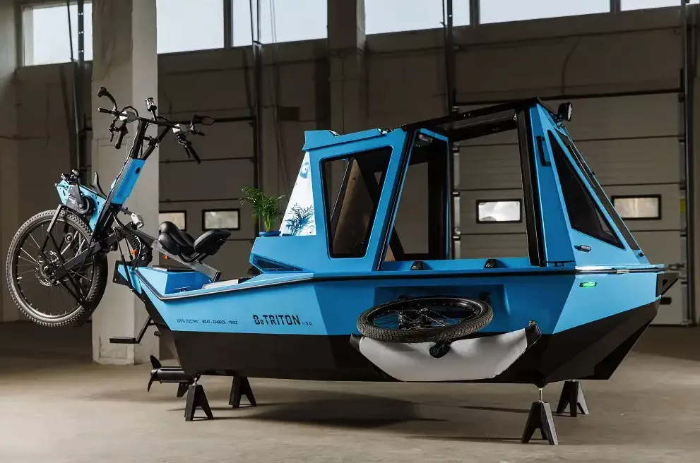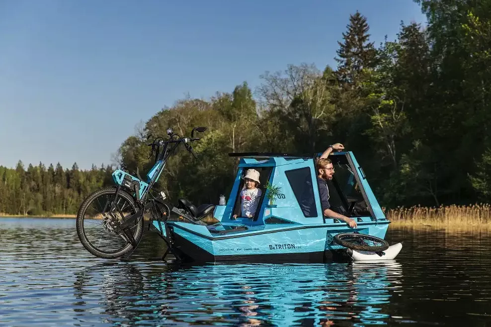 The BeTRITON is designed for calm inland waterways and unpaved roads or trails, not highways or open seas. Depending on the configuration, newer models may also support modular roof setups and towable trailer formats for e-bikes.